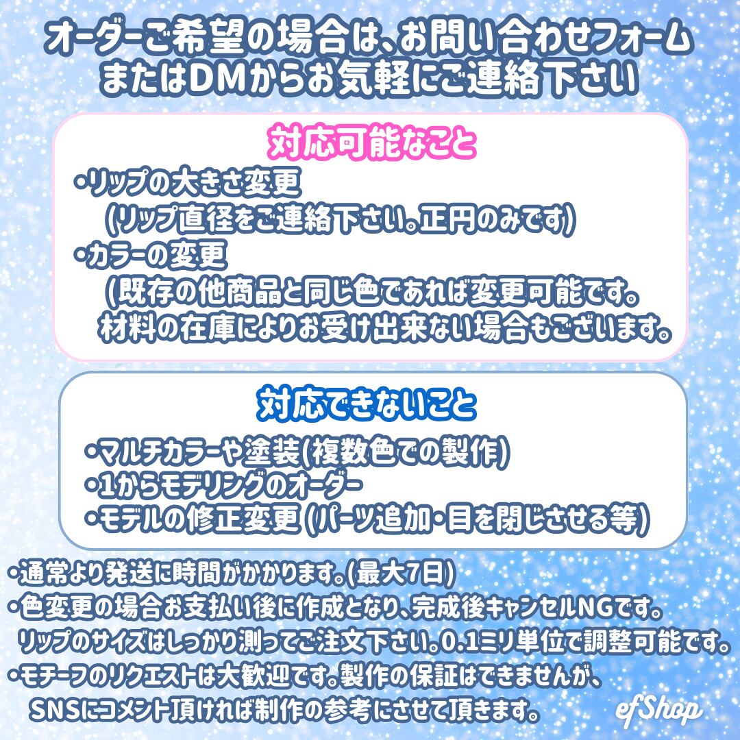 リップサイズや色の変更など、出来る限りご希望に対応させて頂きたいと考えております。