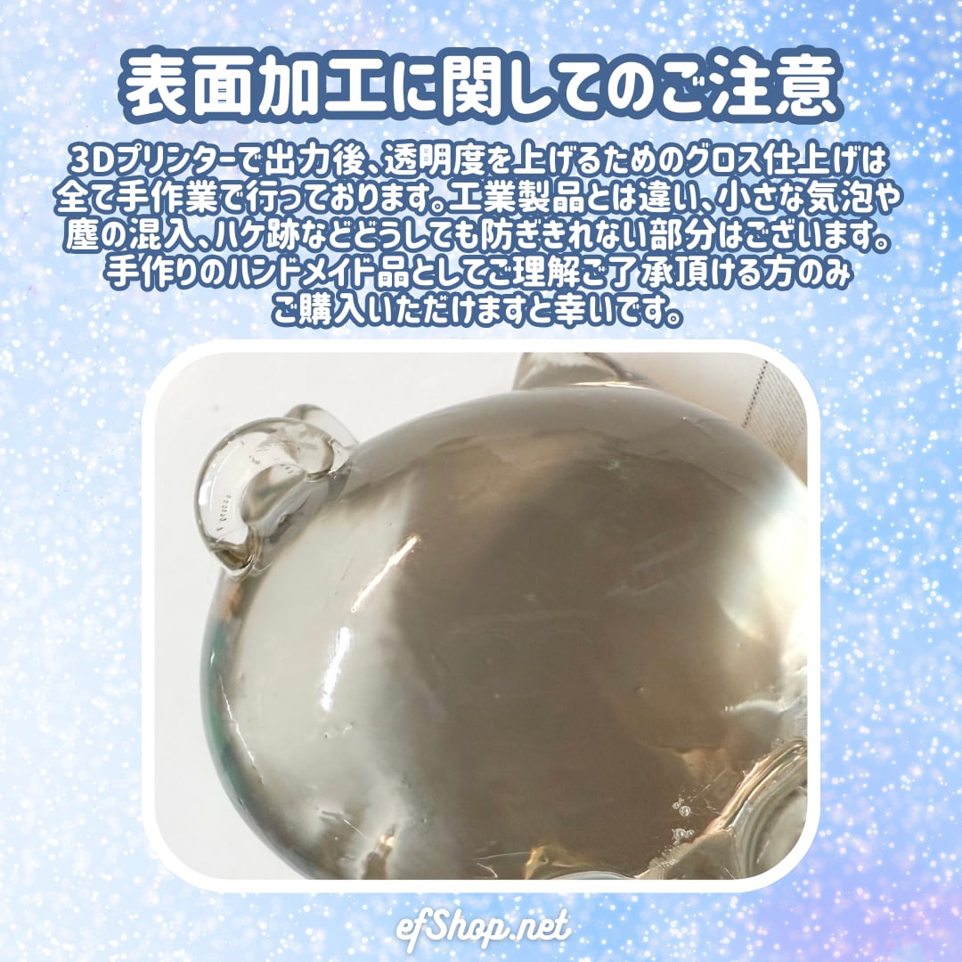 3Dプリンターで造形後、やすりかけ等の仕上げ作業を行い、出来る限り滑らかになるような加工を手作業で施しておりますため僅かに個体差がございます。